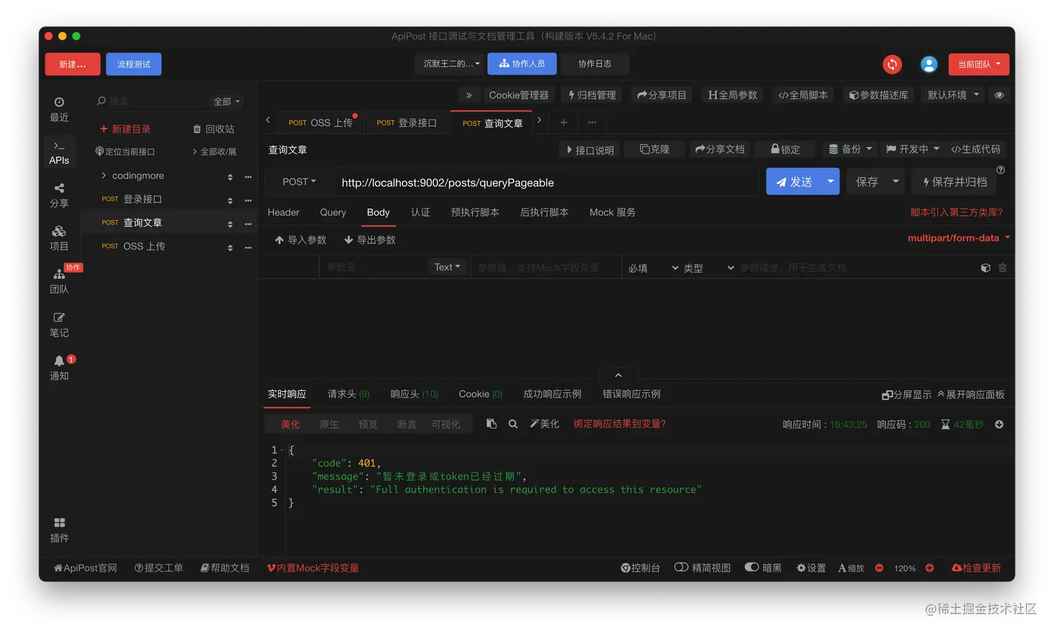 使用 Apipost 来测试一下,首先是文章获取接口,在没有登录的情况下会提示暂未登录或者 token 已过期。