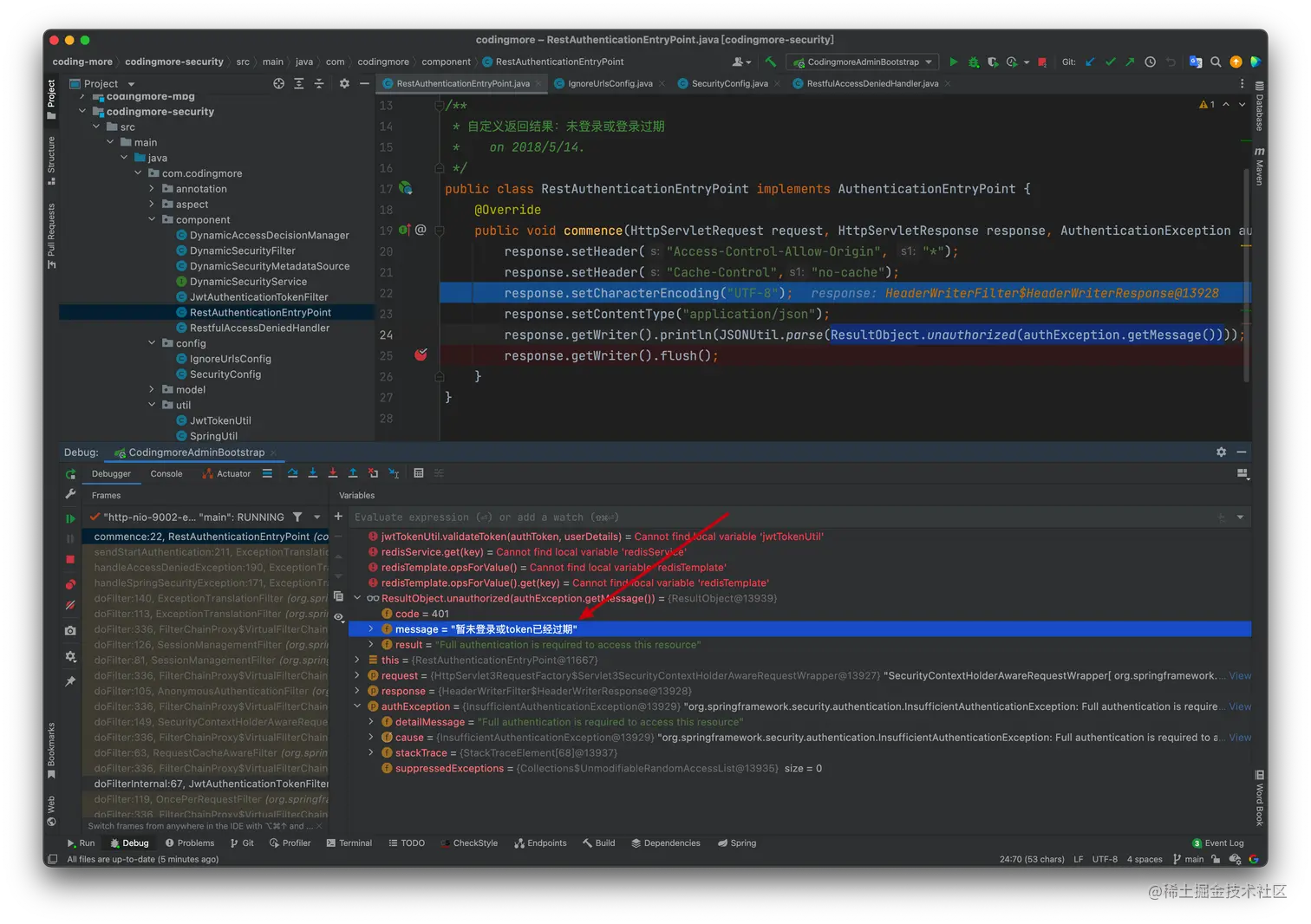 重点来看其他四个类。第一个 RestAuthenticationEntryPoint(自定义返回结果:未登录或登录过期):