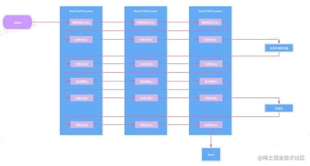 在源码中会更复杂,⽐如源码中会提供⼀些模板⽅法,让⼦类来实现,⽐如源码中还涉及到⼀些BeanFactoryPostProcessor和BeanPostProcessor的注册,Spring的扫描就是通过BenaFactoryPostProcessor来实现的,依赖注⼊就是通过BeanPostProcessor来实现的