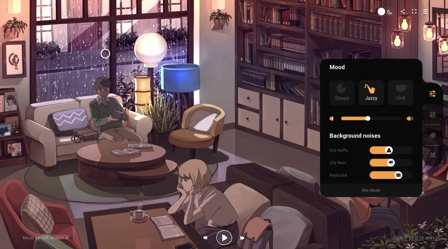 - lofi.co 是一个网络收音机,上周我在 Twitter 上推荐的一个产品,很多人都喜欢,可以在工作的时候听,最有意思的是可以切换场景,模拟在书店,咖啡厅,户外居然还有Van Life的场景!插画非常棒! 有三种音乐类型切换:chill, jazzy or sleepy,还可以添加白噪音(车流,下雨声,键盘声)