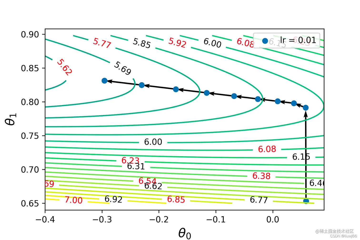 theta[1, 0] = theta[1, 0] - lr*j2