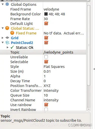 特别注意这个! 将Fixed Frame修改为velodyne, 添加PointCloud2的topic为/velodyne_points