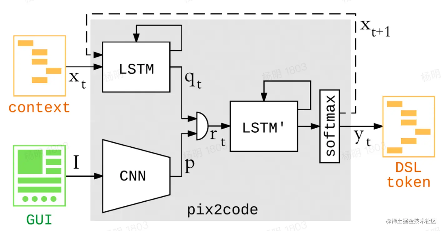CNN擅长抽取图片特征,用于前部分理解输入设计稿的语义特征:有哪些UI元素、布局、样式等。