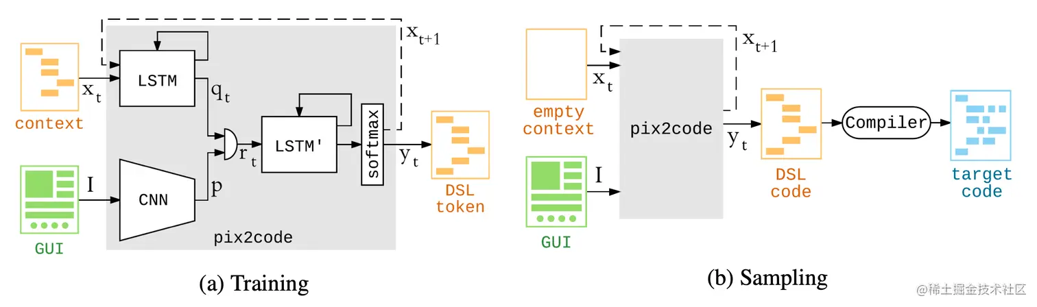 - 在训练阶段,网络会同时将UI图片和DSL代码作为输入;
