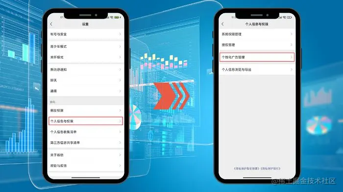 第2步:进入设置后,在里面找到“个人信息与权限”这个功能选项并进入,随后便看到了“个性化广告管理”这个设置,点击它;