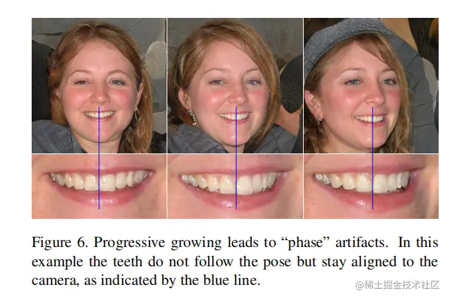 styleGAN使用Progressive growth会有一些缺点。如下图,当人脸左右偏转的时候,牙齿没有偏转: