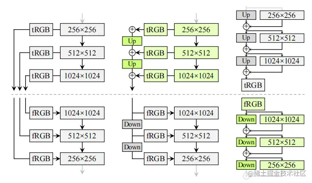 左边的就是类似Unet的对应分辨率的skip connection,也叫是MSG-GAN的研究。然后图b是将图片转换成3通道的RGB图像,然后在做上下采样的连接。而图c则是采用类似残差链接的方式。