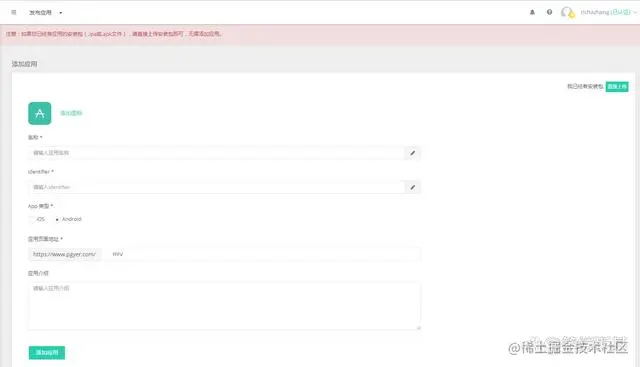 上传完成后,填写应用名称、包名、App 类型、应用介绍、应用图标等信息。