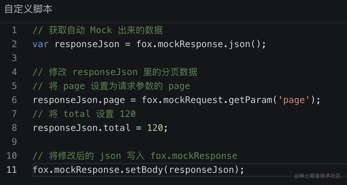 fox.mockRequest.getParam('page')获取实际请求参数 page,赋值给变量 responseJson 里的 page 字段。 - 把 responseJson 的 total 字段重写为 120。