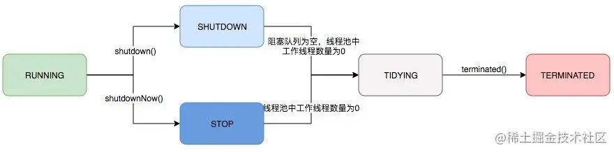 它试图终止线程的方法是通过调用Thread.interrupt()方法来实现的,但是这种方法的作用有限,如果线程中没有sleep 、wait、Condition、定时锁等应用, interrupt()方法是无法中断当前的线程的。所以,shutdownNow()并不代表线程池就一定立即就能退出,它也可能必须要等待所有正在执行的任务都执行完成了才能退出。 但是大多数时候是能立即退出的