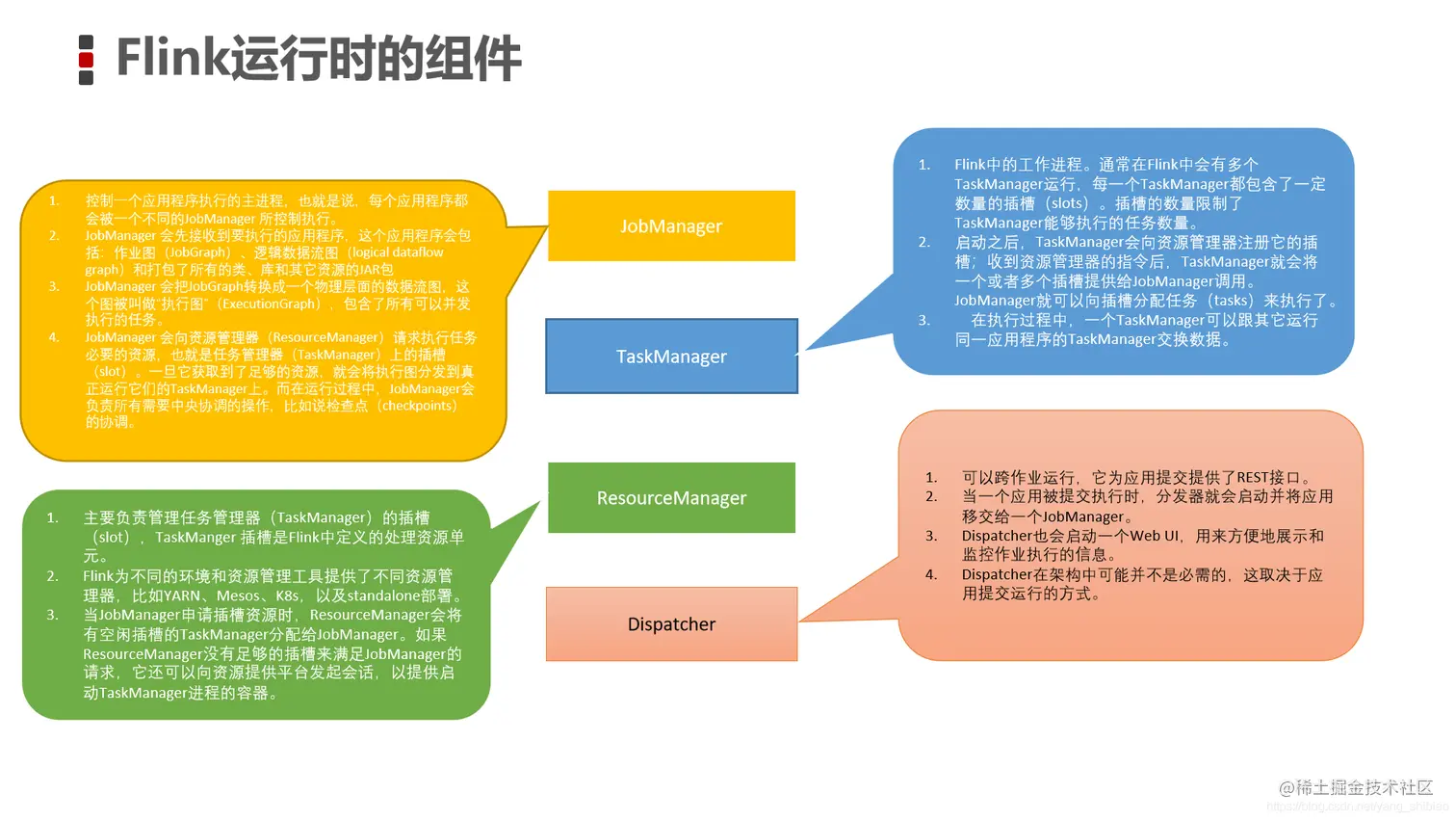 Flink运行时架构主要包括四个不同的组件,它们会在运行流处理应用程序时协同工作,并且都是运行在Java虚拟机上的:
