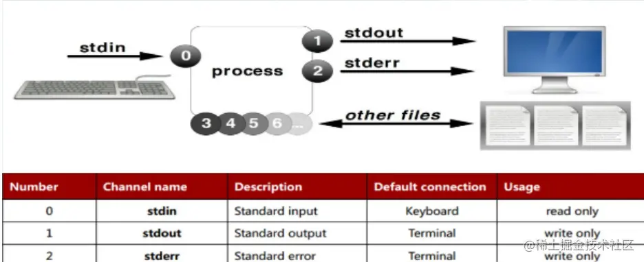 运行一个程序时 , 需要从某个位置读取输入信息 , 然后 cpu 处理, 最后将输出显示到屏幕或文件进程通过文件描述符的编号通道来获取输入并输出。
