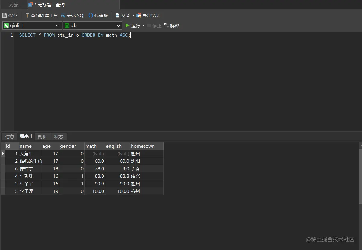 SELECT * FROM stu_info ORDER BY age DESC, math ASC;