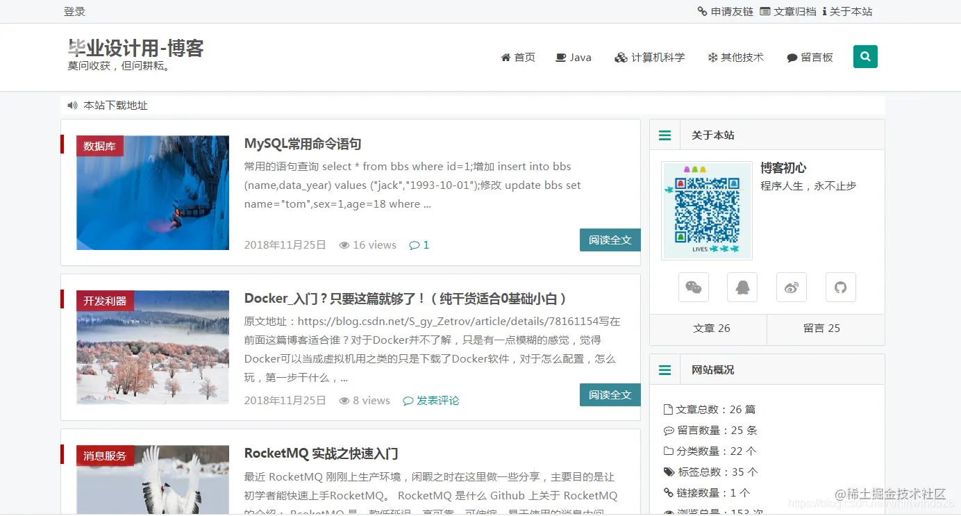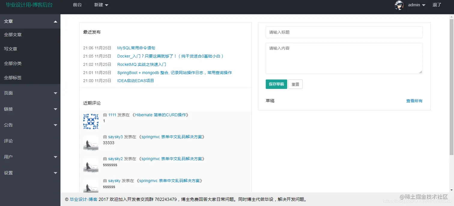 该博客是基于SSM实现的一个个人博客系统,适合初学SSM和个人博客制作的同学学习。 主要涉及技术包括的包括 Maven、Spring、SpringMVC、MyBatis、Redis、JSP等。 前端采用Layui框架