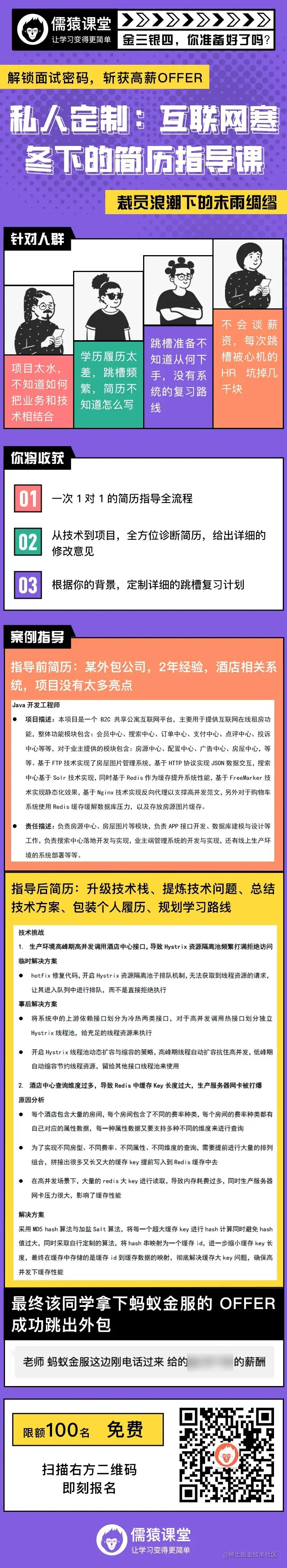 另外就是如果有兄弟最近在写简历或者准备面试,但是对自己的简历或者项目没什么信心,欢迎加入我们的免费简历指导社群,这个社群里,我们会经常分享简历优化案例,同时还有技术大牛可以1对指导简历,让简历更好!