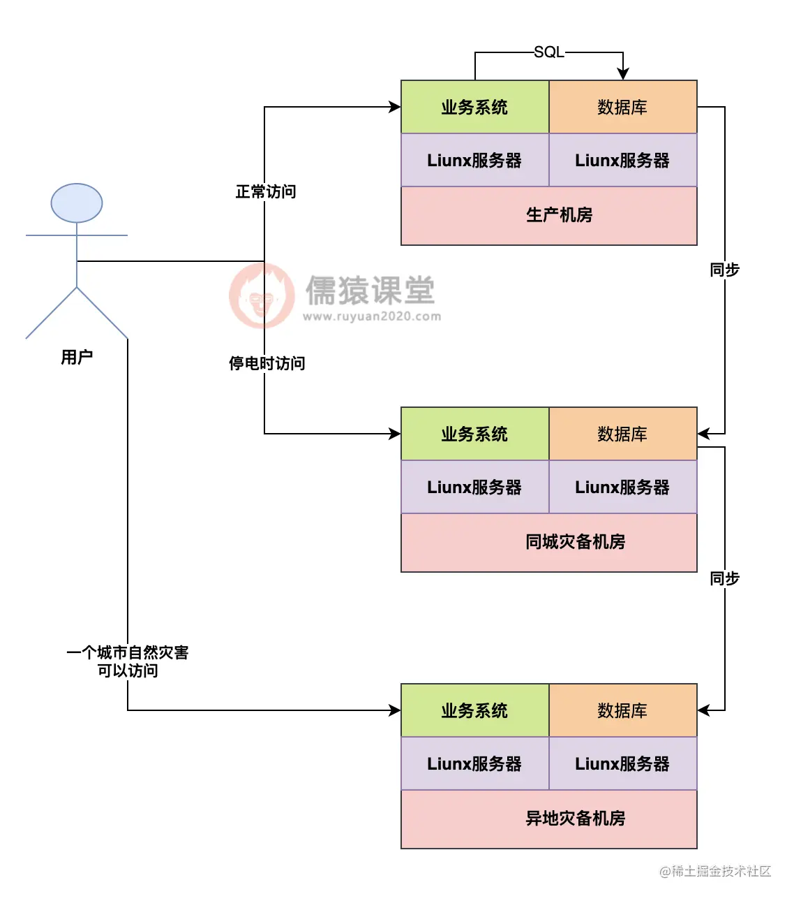 但是呢,另外一个机房里也是有两台服务器,一台部署系统,一台部署数据库,此时我们可以让生产机房里的数据库的数据实时同步到同城灾备机房的那个数据库里去,一旦要是生产机房停电了,直接就访问同城灾备机房的系统就好了啊,数据在那个机房的mysql了都是有的,如下图。