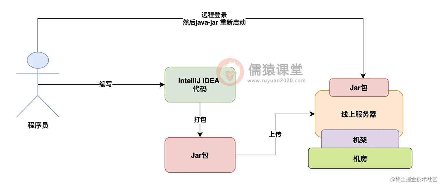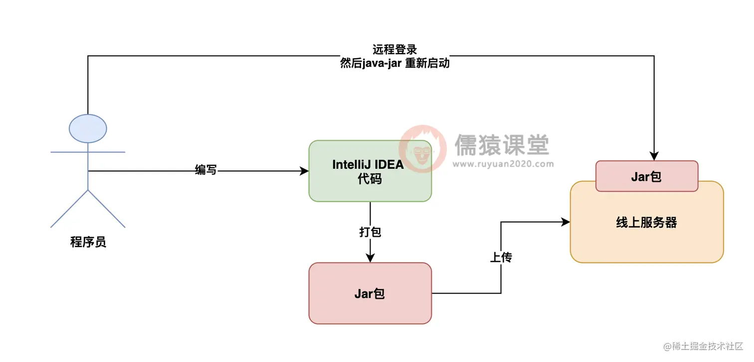 然后写完了代码你得把代码打包上传到线上服务器上,并且在线上服务器里用jar包重新启动系统。这个过程你可以自己手工操作,也可以借助jenkins一类的工具自动化流水线部署,但是大致流程如下图。