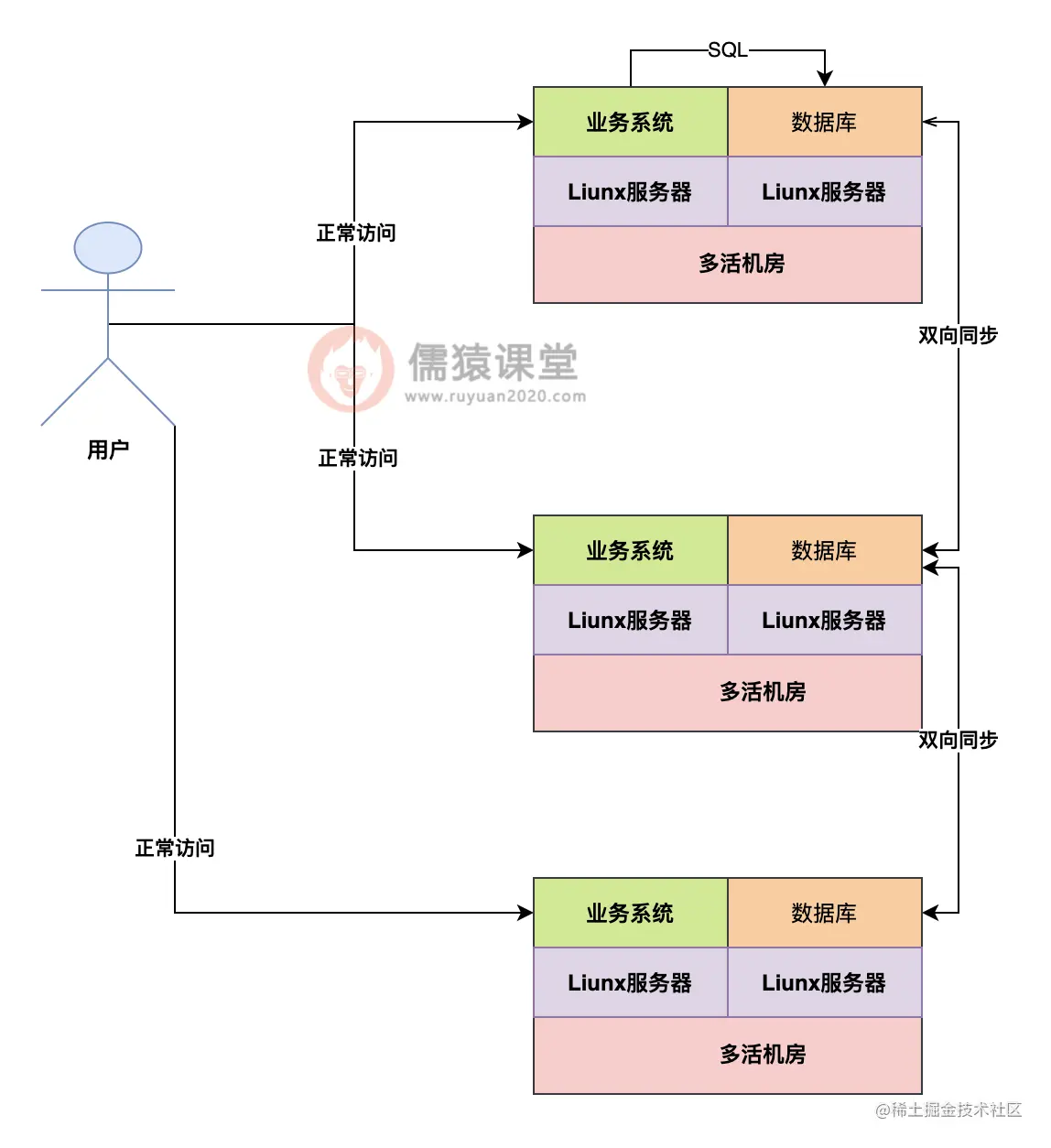 但是这么做还有一个问题,平时就用一个机房的资源,另外2个机房就是同步数据做灾备的,发生停电、自然灾害的时候,才会用到灾备机房,这可怎么办呢?所以后来设计出了多活架构,就是说,上述三个机房都可以访问,哪个机房写入了数据,他就会把数据同步给另外俩机房,如下图。