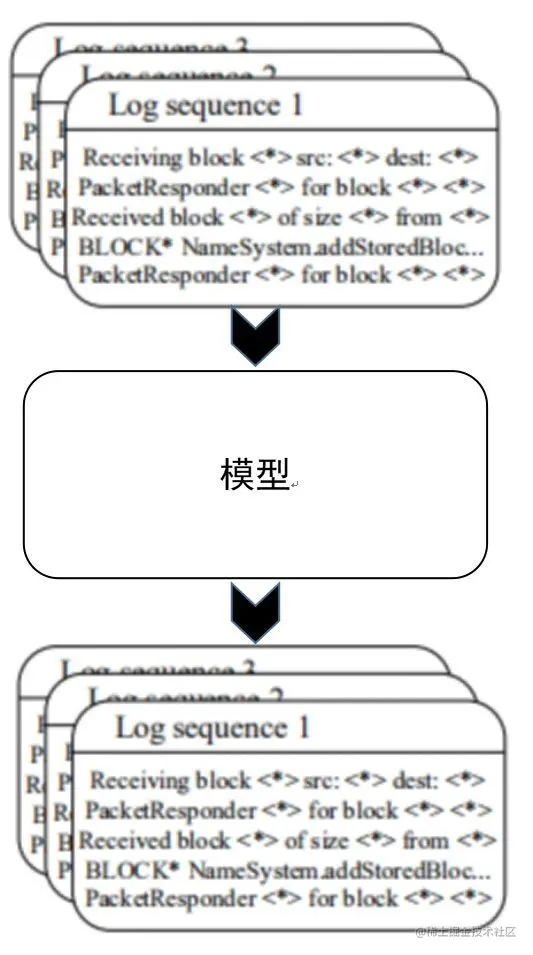 由于日志异常检测具有上述特点,所以在日志异常检测之前我们会有一个环节叫做日志解析。日志解析的目的就是把半结构化的数据处理为成结构化的,同时将参数提取出来。这时即使两条日志的参数不同,但是当把它都用星号来代替的时候他们就是一样的。我们把这种“event template”称之为日志模板,最终人工智能就是对这个日志模板进行处理,电脑或者算法就可以识别出哪些数据是同一类的。几十万条日志数据在通过日志解析后,就被统一成了几十条或者是几百条的日志模板,再通过识别最终的日志模板的一个语义信息就可以明白日志的内容。