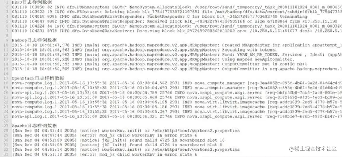 - 第二个特点就是对于日志而言,不同的系统产生的日志格式不同。比如下图中HDFS的日志数据的第一项不是日期,但是Hadoop的第一项就是日期。因日志数据格式不同,在我们想用一套比较好的算法,统一地去解决一系列的问题时,就会面临一定的挑战。