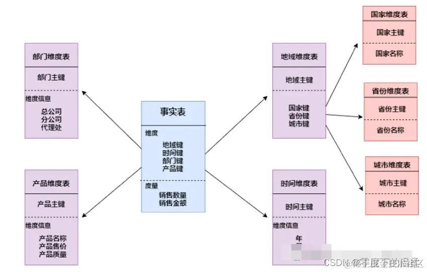 雪花模式(Snowflake Schema)是对星形模式的扩展。雪花模式的维度表可以拥有其他维度表的,虽然这种模型相比星型更规范一些,但是由于这种模型不太容易理解,维护成本比较高,而且性能方面需要关联多层维表,性能比星型模型要低_大数据培训。