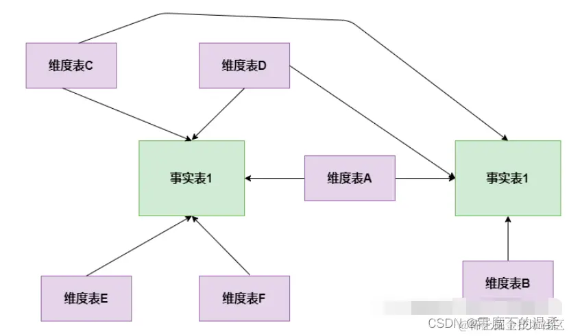 星座模式是星型模式延伸而来,星型模式是基于一张事实表的,而星座模式是基于多张事实表的,而且共享维度信息。前面介绍的两种维度建模方法都是多维表对应单事实表,但在很多时候维度空间内的事实表不止一个,而一个维表也可能被多个事实表用到。在业务发展后期,绝大部分维度建模都采用的是星座模式。