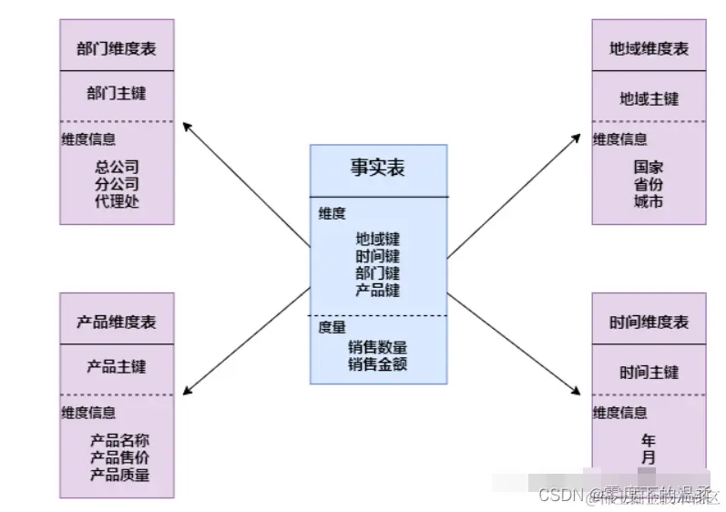 星形模式(Star Schema)是最常用的维度建模方式。星型模式是以事实表为中心,所有的维度表直接连接在事实表上,像星星一样。星形模式的维度建模由一个事实表和一组维表成,且具有以下特点: