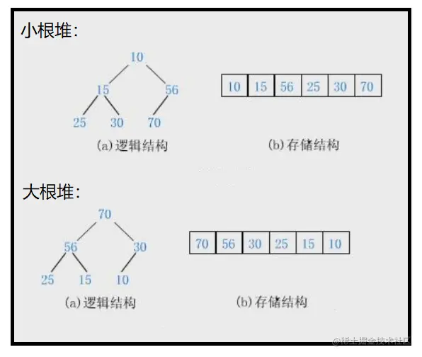 我们将根节点最大的堆称作最大堆(即大根堆),根节点最小的堆称作最小堆(即小根堆)。