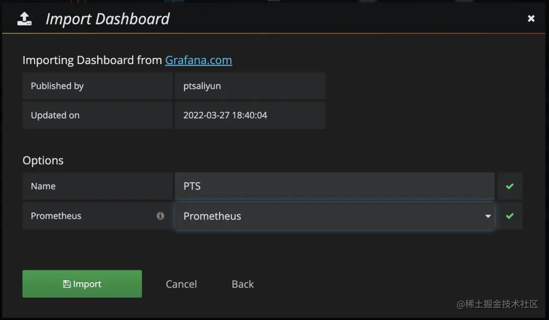 在 Prometheus 选择您已有的数据源,本示例中数据源名为 Prometheus。选中后,单击 Import 导入