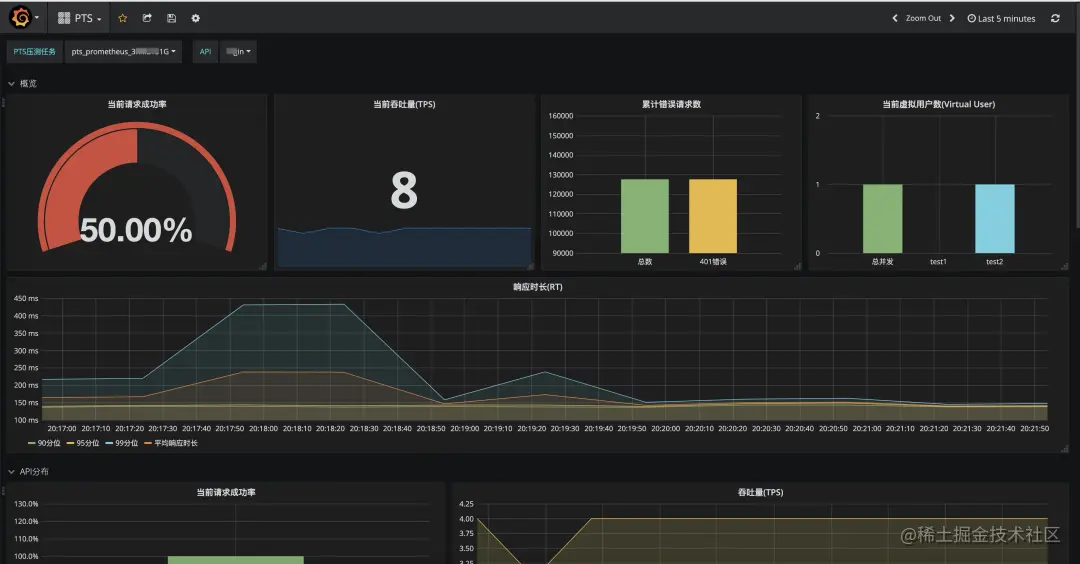 导入后,在左上角【PTS 压测任务】,选择需要监控的压测任务,即可看到当前监控大盘。