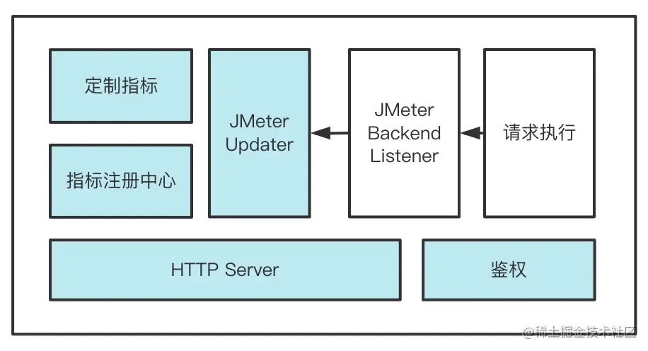 JMeter 提供了插件机制,可以自定义插件来扩展 Prometheus 监控能力。在自定插件中,需要扩展 JMeter 的 BackendListener,让在采样器执行完成时,更新每个压测指标,如成功请求数、失败请求数、请求响应时长。并将各压测指标在内存中保存,在 Prometheus 拉数据时,通过 HTTP 服务暴露出去。整体结构如下: