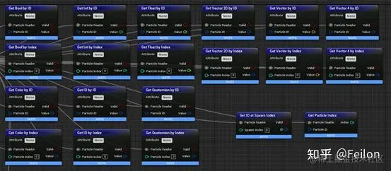 它的节点也非常简单,都是一些 Get 类型的节点,总的来说可以获取的类型包括:Bool、Int、Float、Vector2D、Vector、Vector4、Color、NiagaraID、Quaternion。获取的方式分两种,一种是通过 Execution Index,另一种是通过 NiagaraID 获取。两种方式的差别不大。