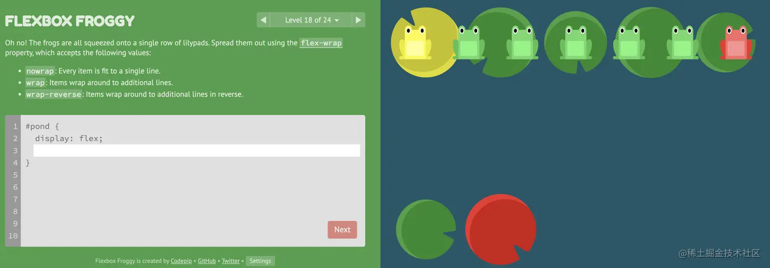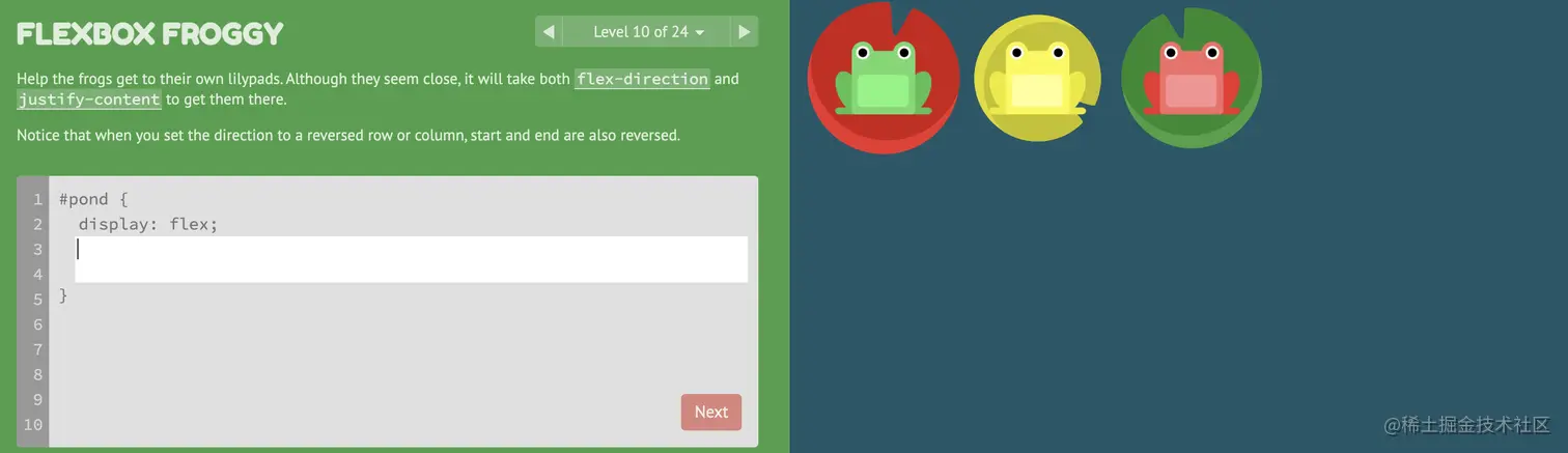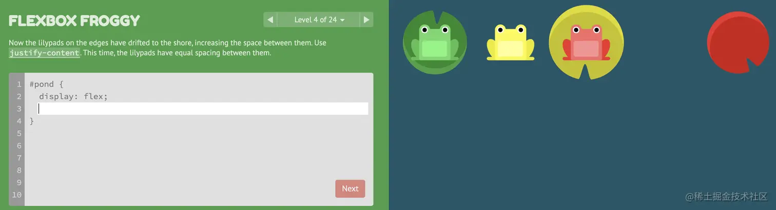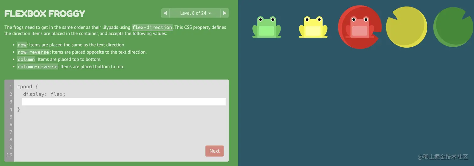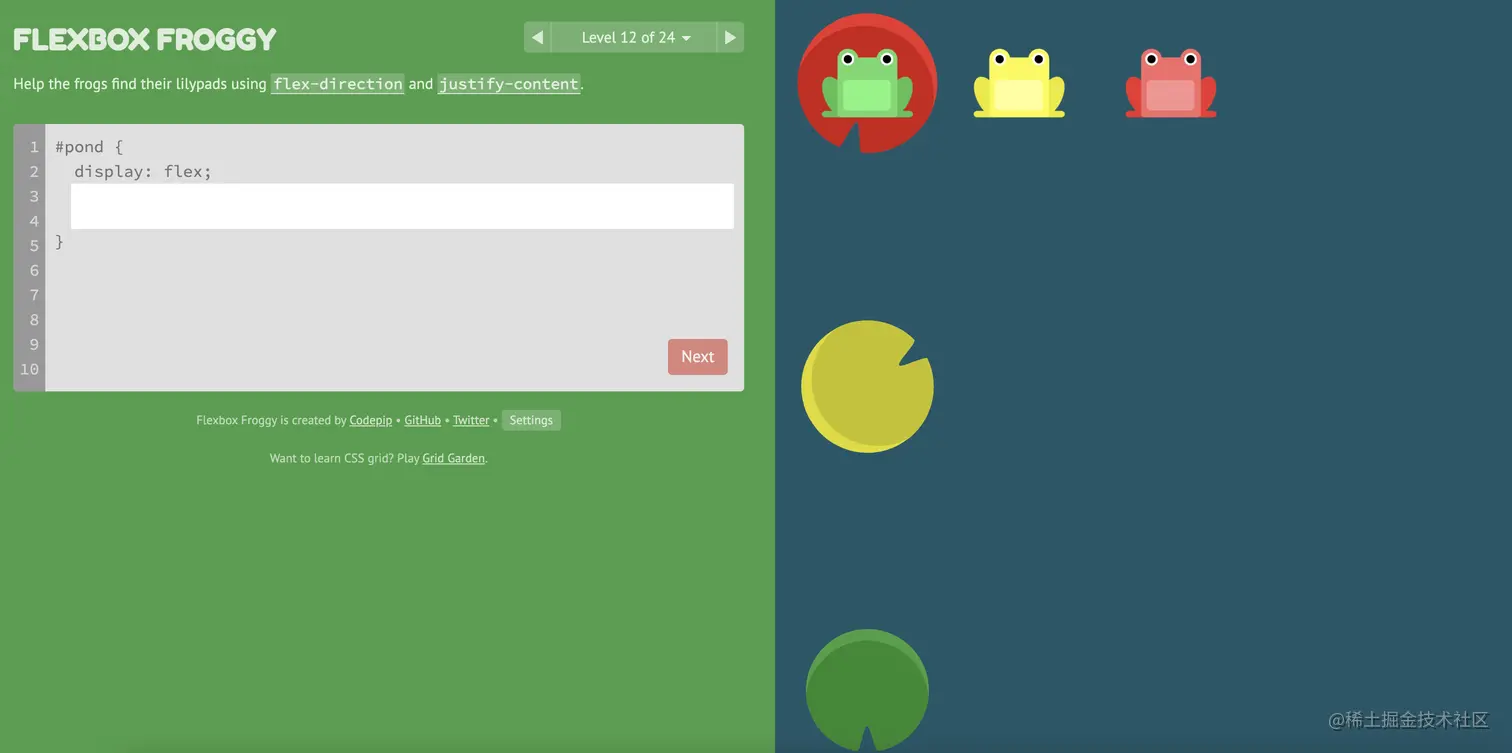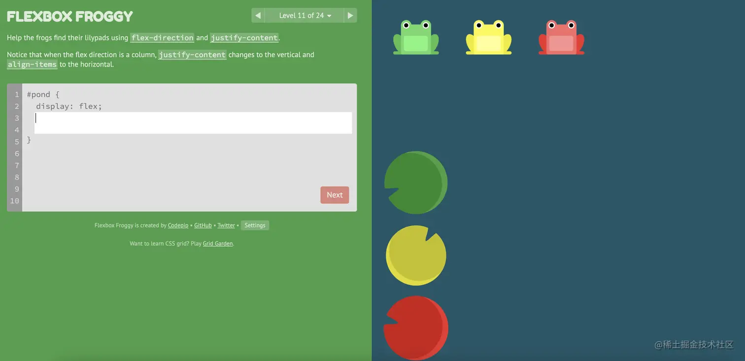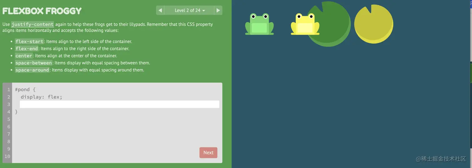 游戏玩法:通过修改flexbox的属性值,使青蛙移动到与其同色的荷叶上。