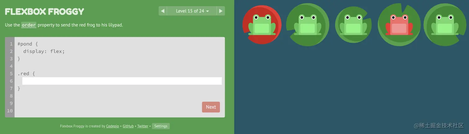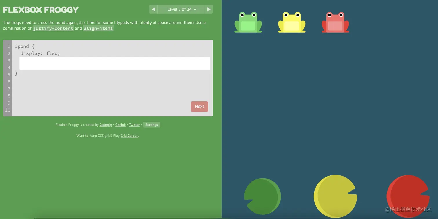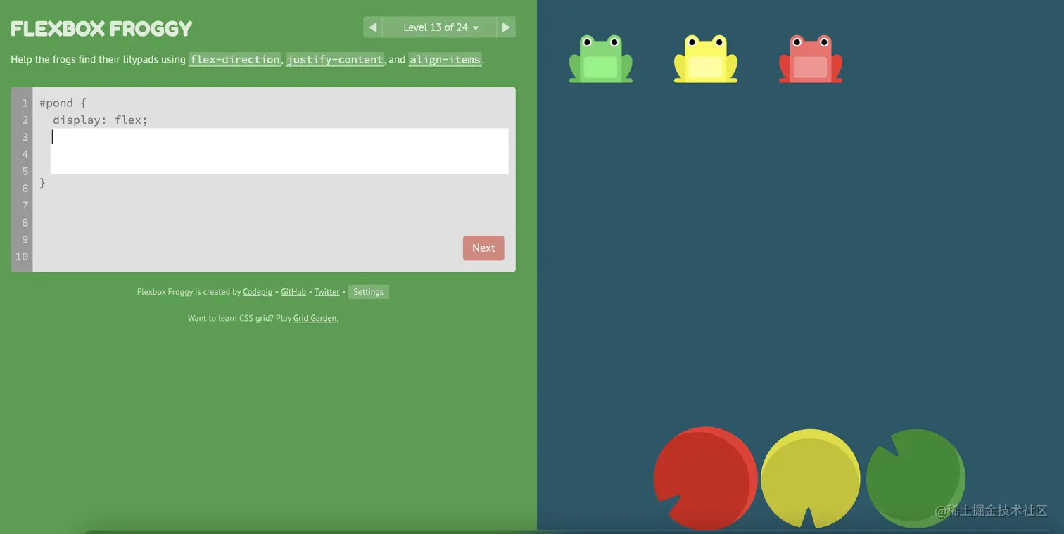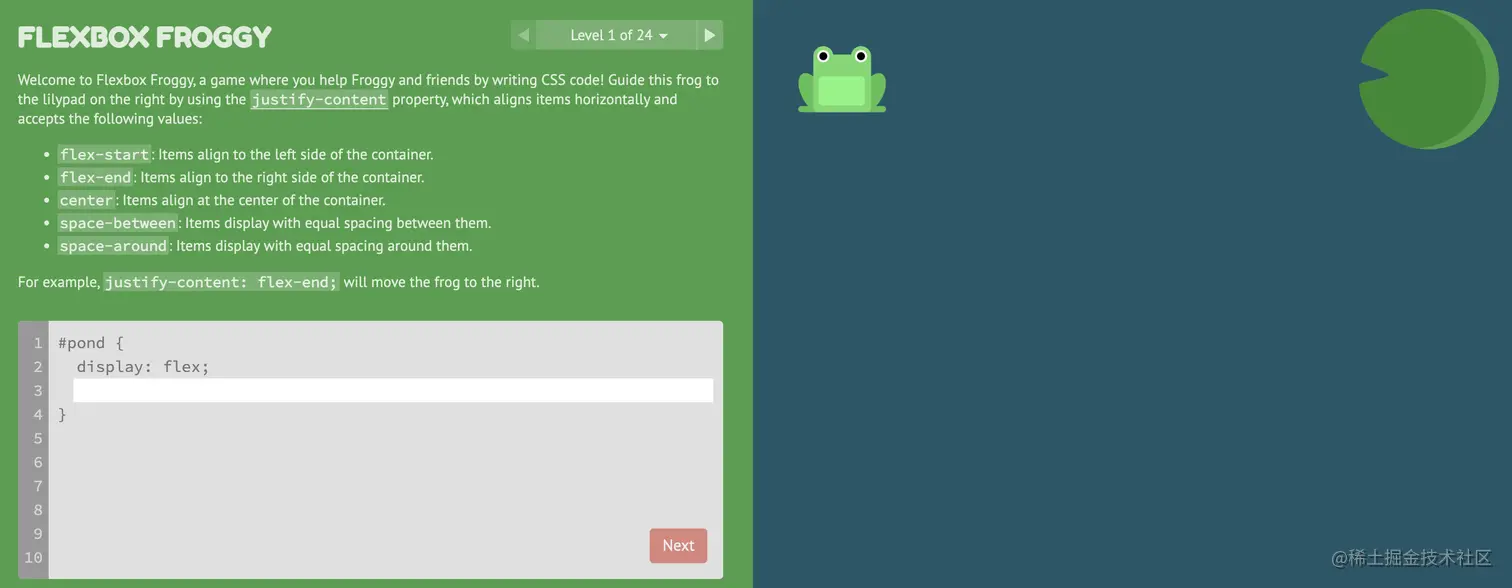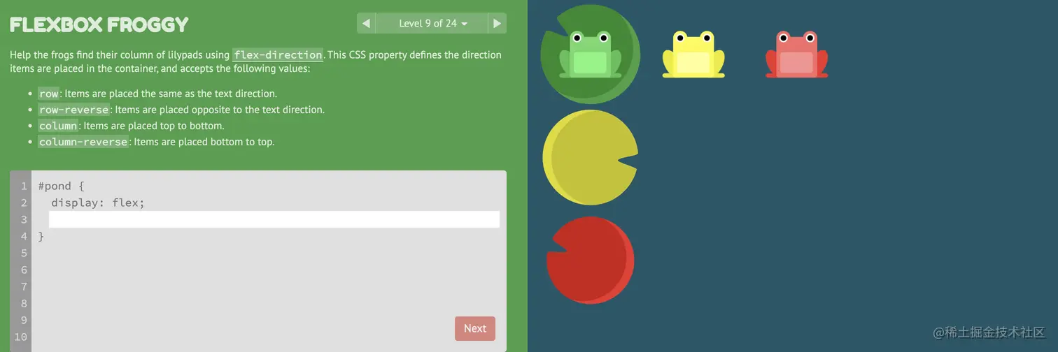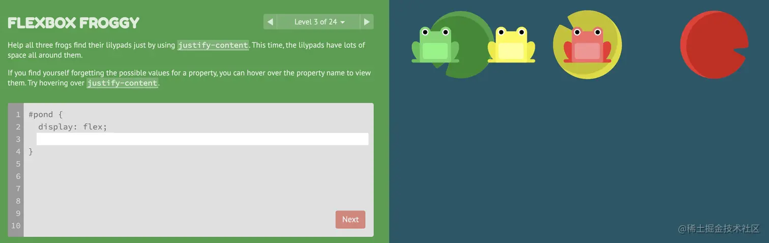 游戏玩法:通过修改flexbox的属性值,使青蛙移动到与其同色的荷叶上。