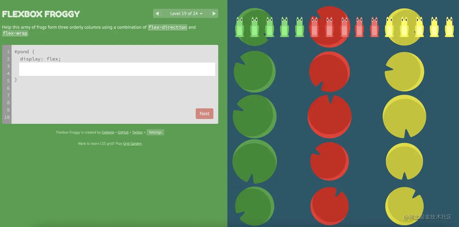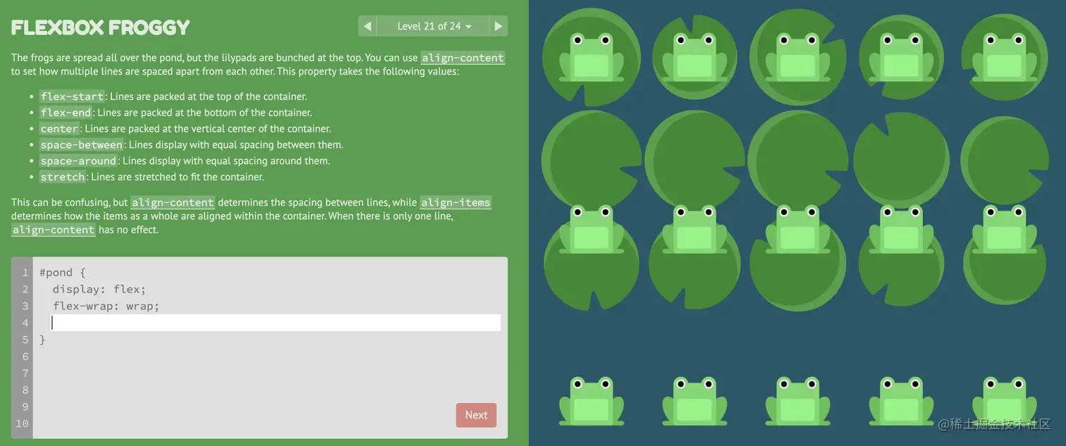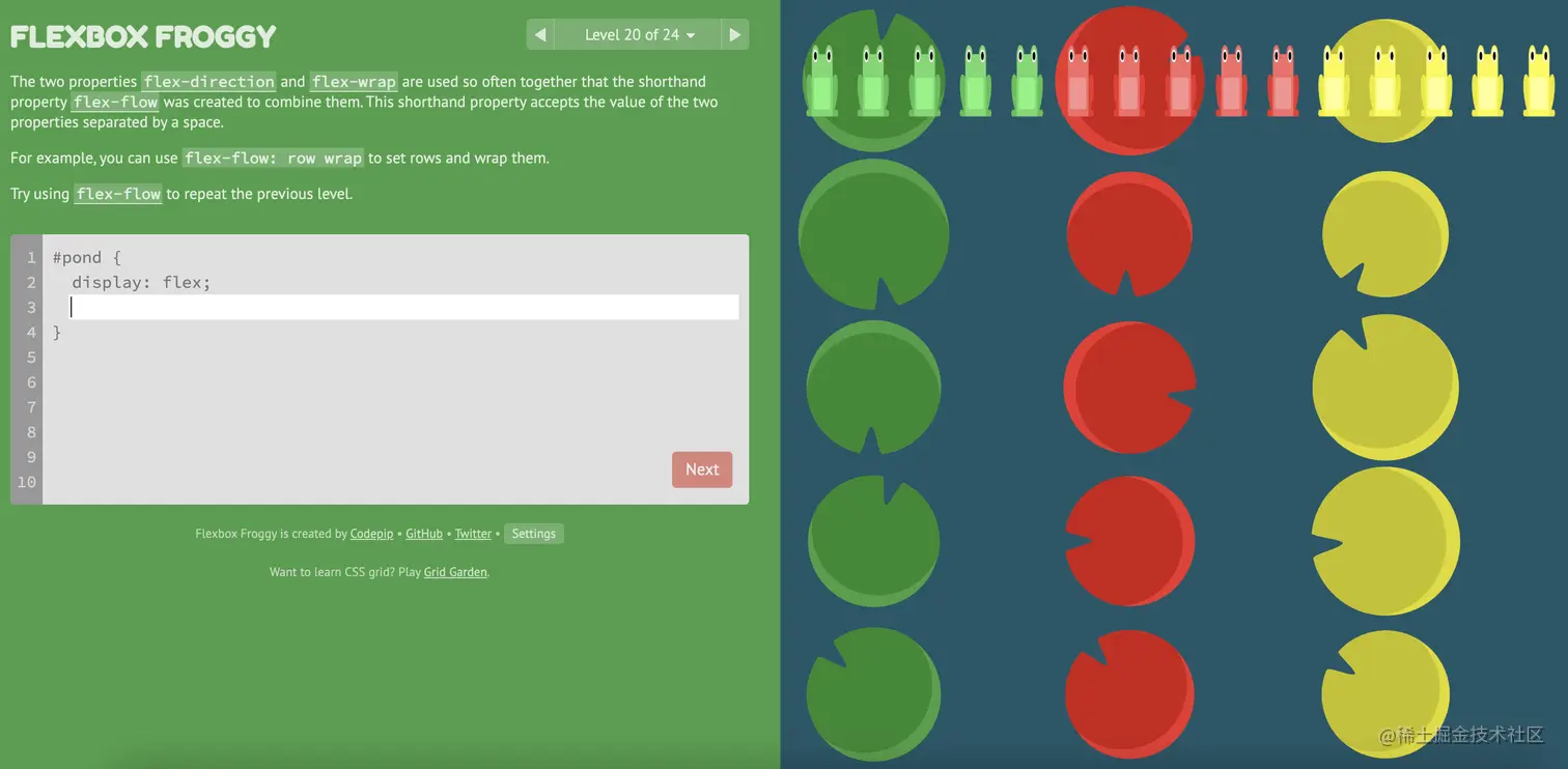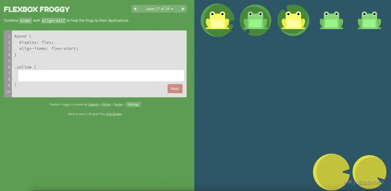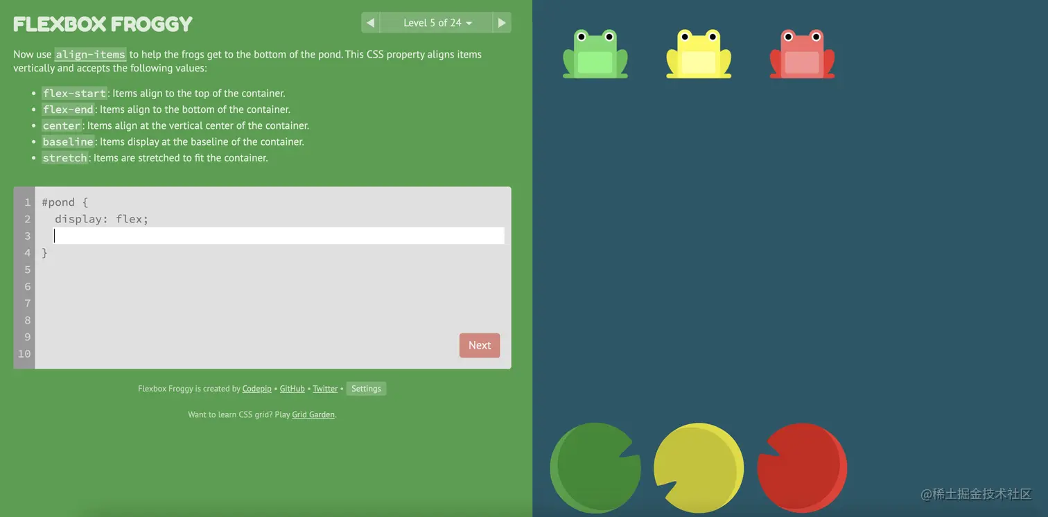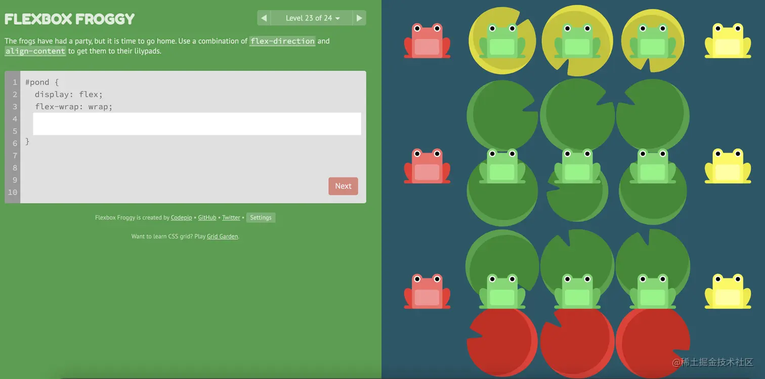游戏玩法:通过修改flexbox的属性值,使青蛙移动到与其同色的荷叶上。