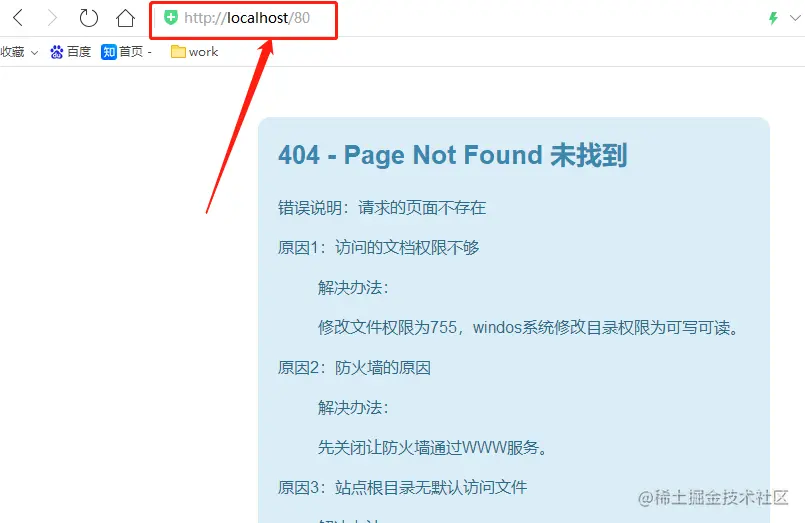 在得到这些信息后,我们就可以在浏览器中输入网页域名+端口,即“localhost:80”,看能打开什么样的网页。