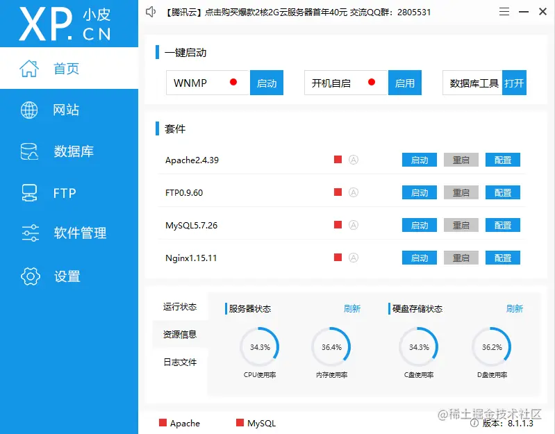 在这里我们能看到,网站运行环境所必须的Apache2、MySQL等均显示为红,也就是本地电脑中并没有这些软件。其中,Apache2、Nginx则可以简单的看做一个代理服务器软件;而MySQL则是网站运行的数据库。