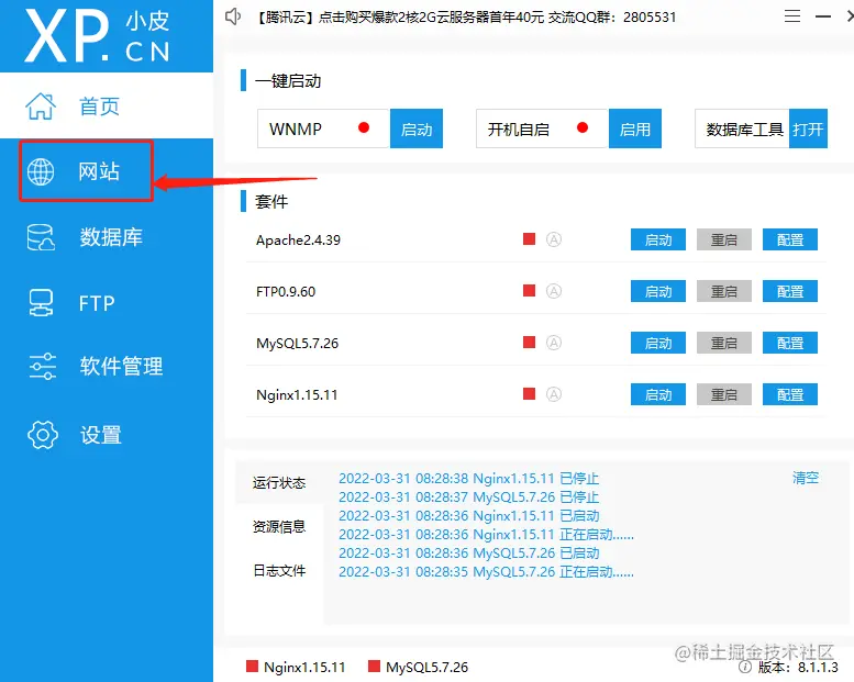 在网站运行环境安装完毕后,我们就可以测试一下,直接点击主界面左侧的“网站”按钮。