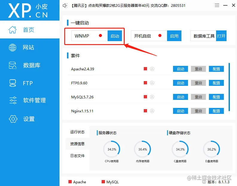 在知道这些组件各自的作用后,我们就能轻松选择需要安装的内容。当然,也有个偷懒的办法,就是选择软件界面上方的“WNMP”,让软件自动安装相关组件。