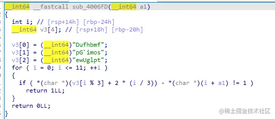 阅读代码可以发现只有for中的if条件满足时才会返回非零1,但是我们想要的是返回,所以要在这11次循环中让if条件不成立,那查看条件