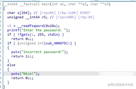 (3)阅读代码可以知道流程:要求用户输入一个字符串存入s中,将s地址作为参数传给sub_4006FD,将sub_4006FD的返回值最为调用sub_4006FD函数的if判断条件,如果返回值为非零值则提示“Incorrect password!”,所以要让sub_4006FD返回值为0