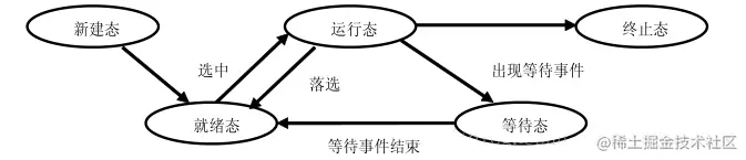 - 运行状态的进程将由于出现等待事件而进入等待状态,当等待事件结束之后等待状态的进程将进入就绪状态,而处理器的调度策略又会引起运行状态和就绪状态之间的切换。