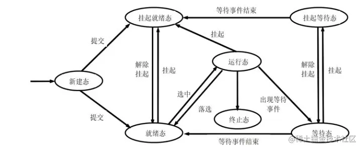 - 下面是具有七态模型的进程状态及其转换: