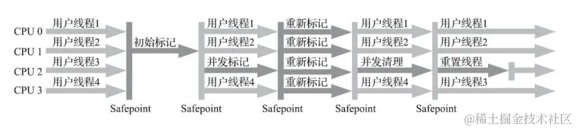 CMS是基于标记-清除算法实现的,整个过程分为四个步骤:
