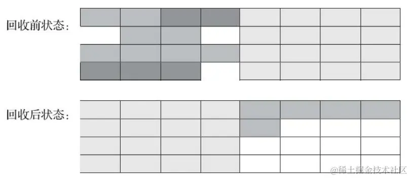这个算法中的标记过程仍然与“标记-清除”算法一样, 但后续步骤不是直接对可回收对象进行清理, 而是让所有存活的对象都向内存空间一端移动, 然后直接清理掉边界以外的内存。