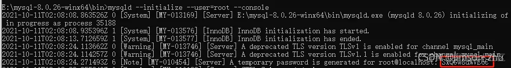 4)初始化MySQL账户和密码:mysqld --initialize --user=root --console