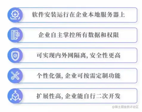私有化部署的优势:①数据安全性更高。私有化部署是基于客户自身的服务器进行部署,直接将系统布置在用户自有的本地服务器上,,无需上传至云端,完全私有化。可以有效防止数据丢失、被平台方泄露、被第三方非法获取或篡改等风险隐患,而且更方便于二次整理,还能灵活对接其CRM、ERP、OA等系统。②按需配置更灵活,可拓展性更强。在很多应用系统的实际使用中,企业组织都有不同程度的个性化需求,需要通过二次开发或定制开发实现,公有云、混合云对这类服务提供的服务是有限的,无法满足用户的要求。而私有本地化部署的系统软件是可以按需定制的,给予了企业充足的二次开发的空间,企业根据自身需求灵活拓展,开发定制出更适配自己的功能应用。③节省开发和管理成本。企业对系统开发无需大量的人力物力,可以一次性支付并获得支持修改的开源技术,之后的使用、开发都不再被原厂商“挟持”,不限部署数、不限用户数、不限应用数,一次采购反复使用,无需再添置大量繁杂的系统,大大节省了后续的成本负担。