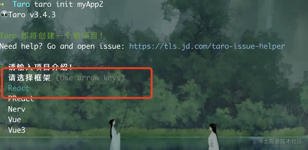 因为我平时使用React框架进行开发,所以迁移的时候也直接选择了React框架。这个选择是在项目初始化的时候选择的,如下图: