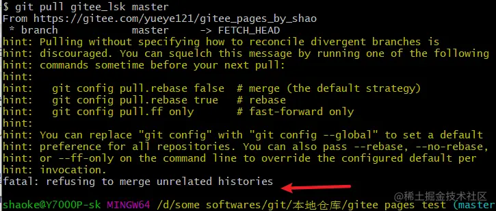 - (2)新建仓库时,第一次push,提示本地和远程有不同的历史( 两个分支是两个不同的版本,具有不同的提交历史)