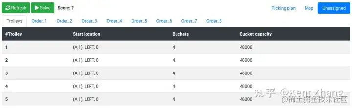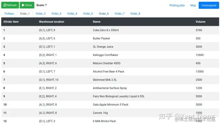 当你首次打开Order picker程序时,你将看不到任何已运算好的拣货计划或拣货路径,不用担心这是正常的,因为规划求解器还未开始运行。在开始执行求解运算前我们先花点时间看看初始化数据集,你可以点击页面上“Unassigned”页签来查看这些数据。(如下图为购物车的数据)